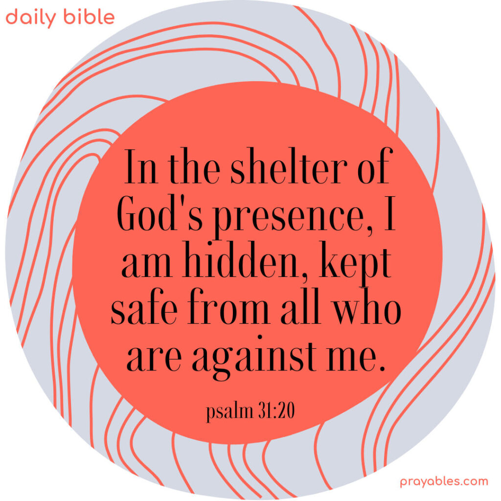 Bible Affirmation: Psalm 31:20 In the shelter of God’s presence, I am hidden, kept safe from all who are against me.Psalm 31:20 Print 🖨