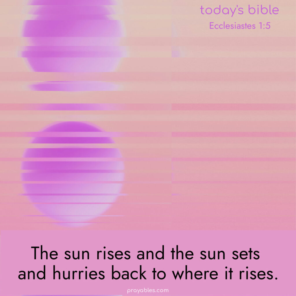 Bible: Ecclesiastes 1:5 The sun rises and the sun sets and hurries back to where it rises. Ecclesiastes 1:5 Print 🖨
