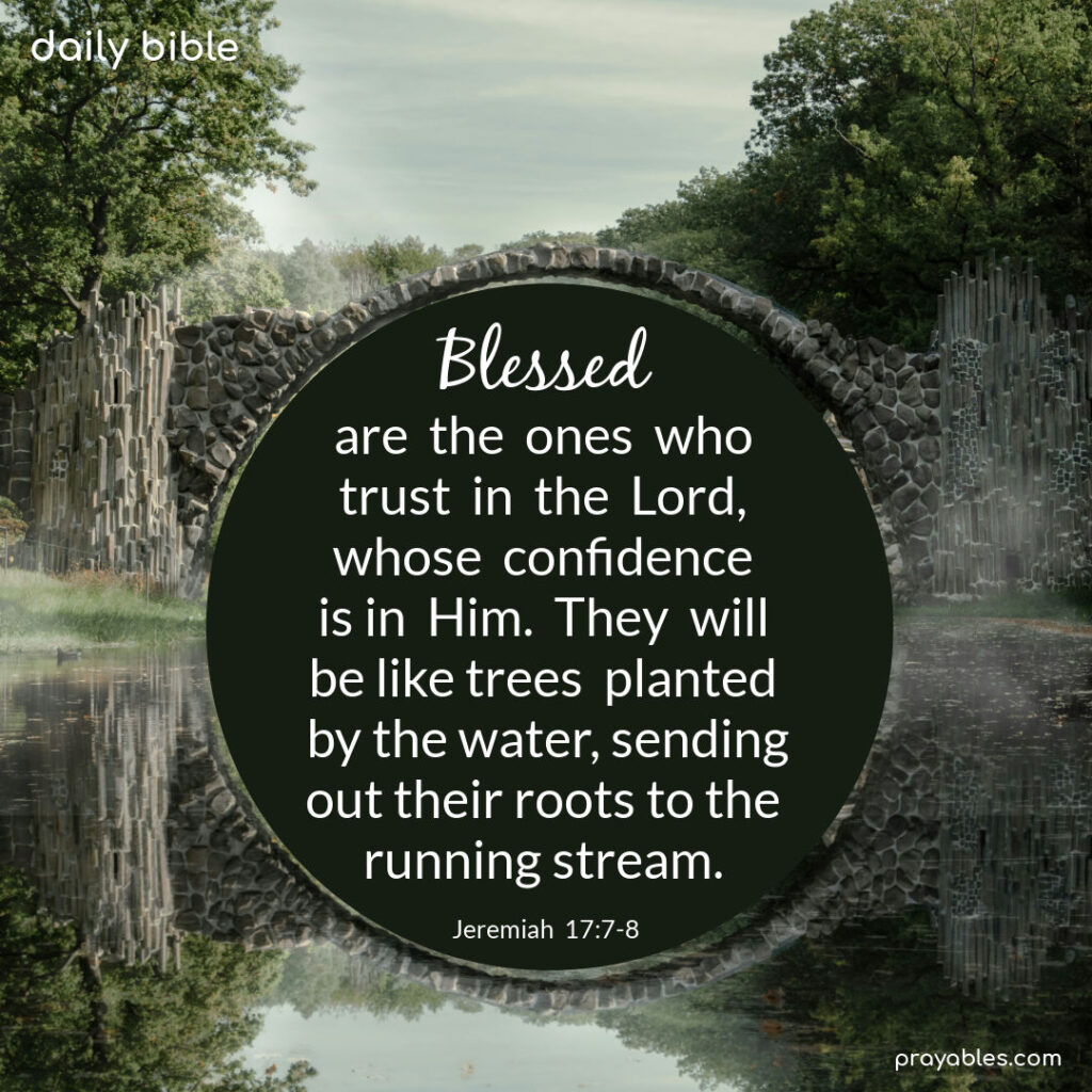 Bible: Jeremiah 17:7-8 Blessed are the ones who trust in the Lord, whose confidence is in Him. They will be like trees planted by the water, sending out their roots to the running stream. Jeremiah 17:7-8 Print 🖨