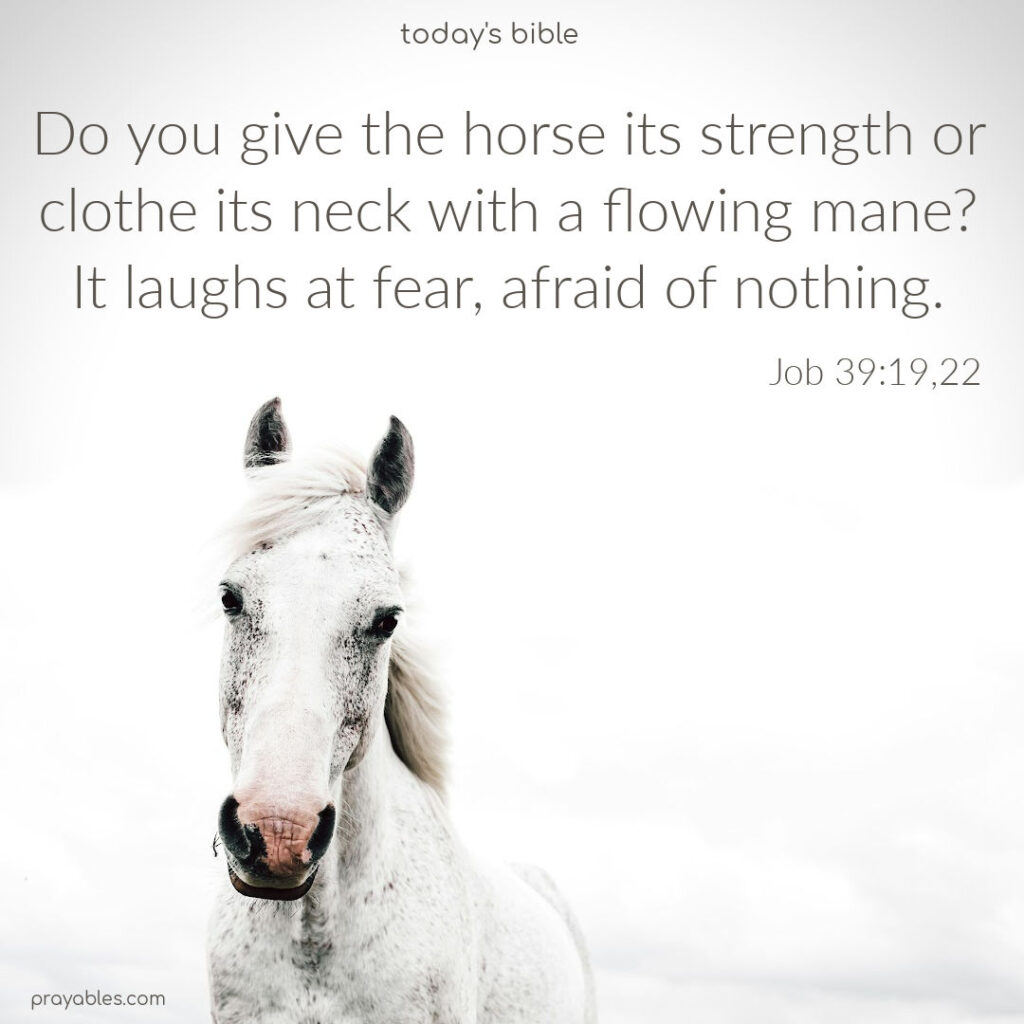 Bible: Job 39:19,22 Do you give the horse its strength or clothe its neck with a flowing mane? It laughs at fear, afraid of nothing. Job 39:19, 22 Print 🖨