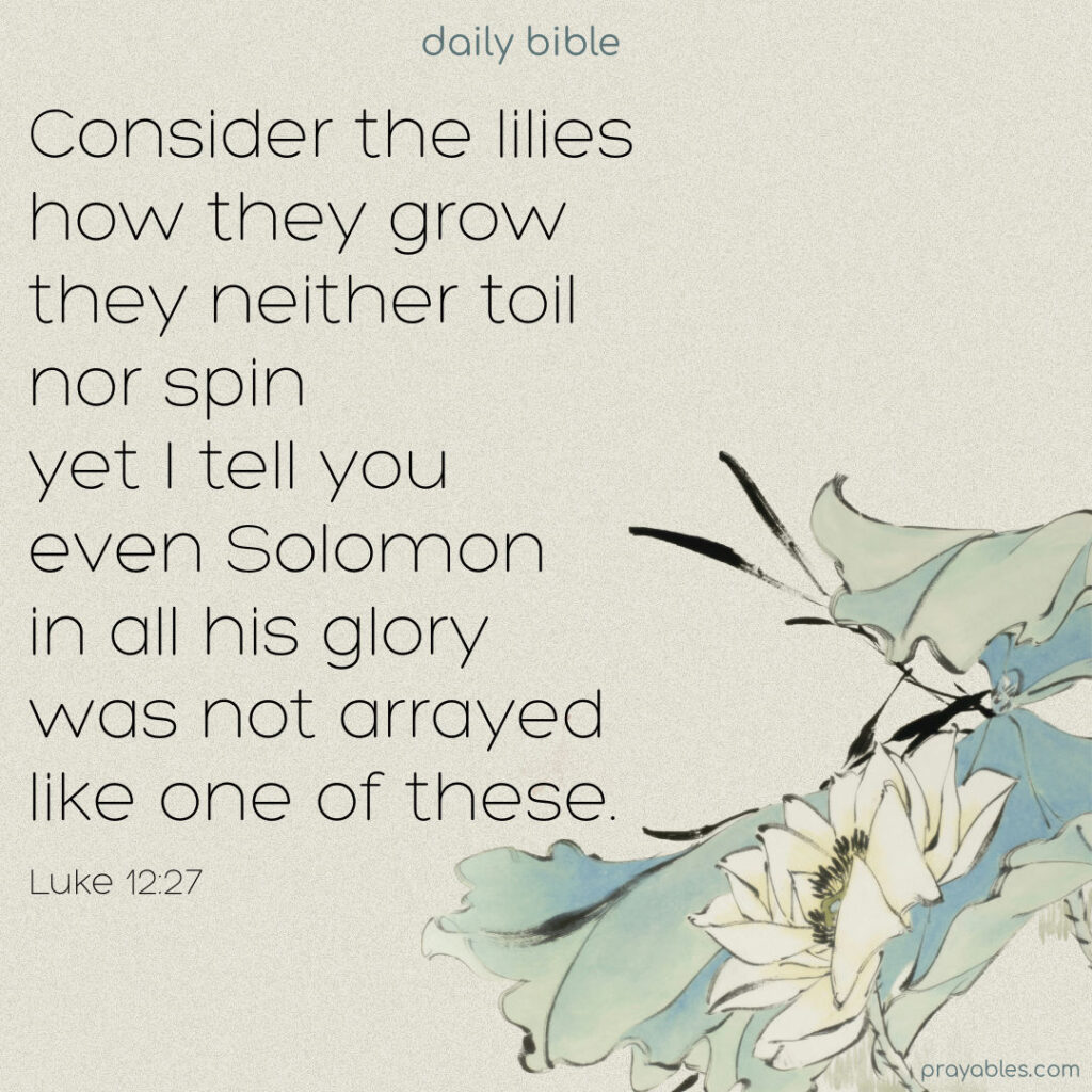Bible: Luke 12:27 Consider the lilies, how they grow, they neither toil nor spin. Yet, I tell you, even Solomon in all his glory was not arrayed like one of these. Luke 12:27 Print 🖨