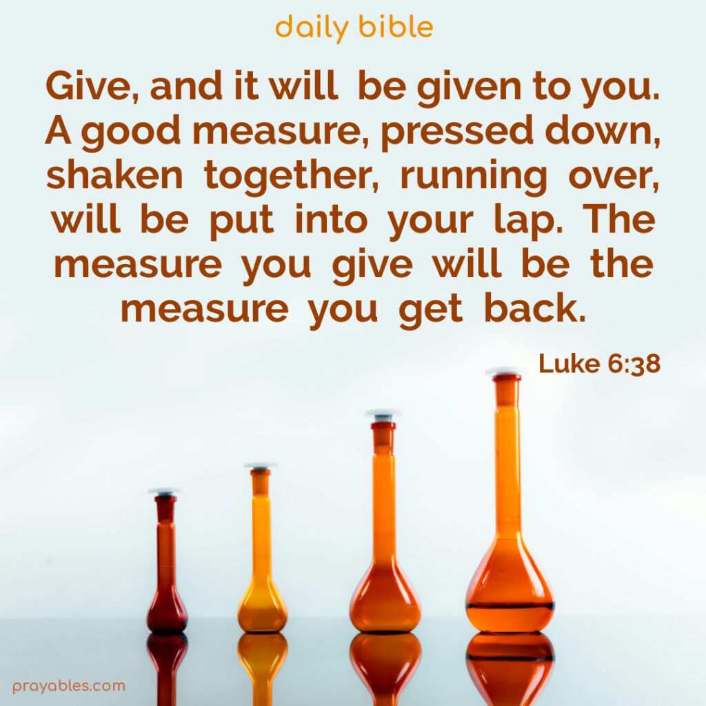 Bible: Luke 6:38 Give, and it will be given to you. A good measure, pressed down, shaken together, running over, will be put into your lap. The measure you give will be the measure you get back. Luke 6:38 Print 🖨