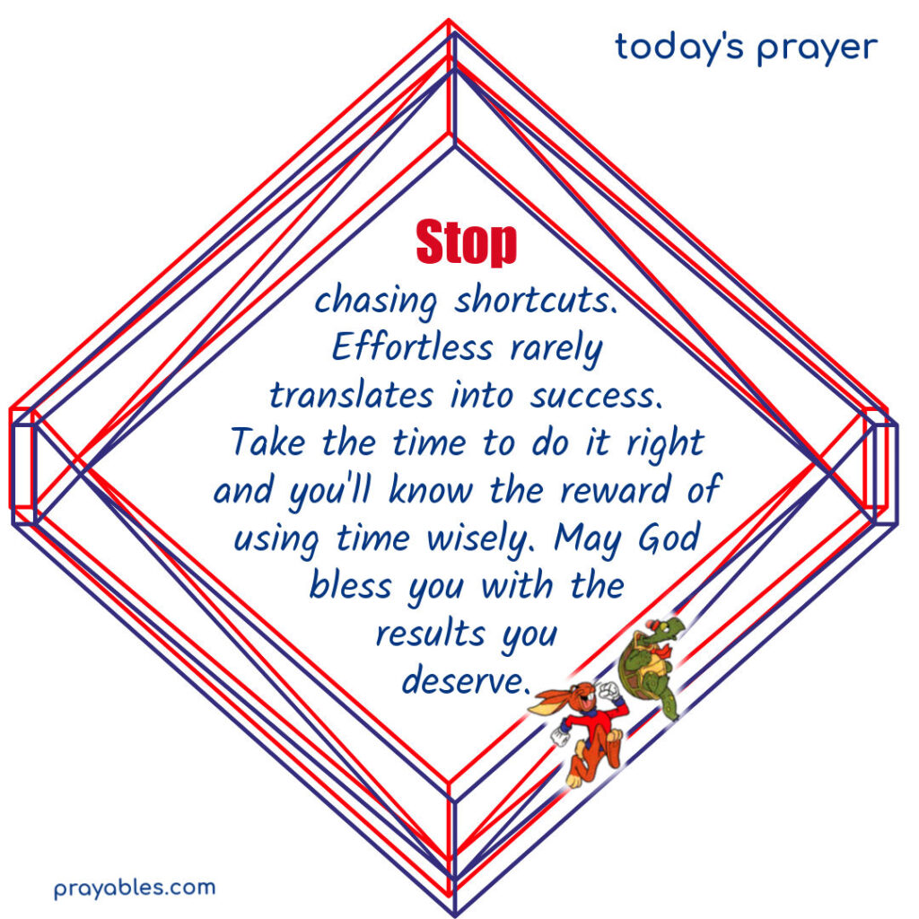 Blessing: Shortcuts Stop chasing shortcuts. Effortless rarely translates into success. Take the time to do it right and you’ll know the reward of using time wisely. May God bless you with the results you deserve. Print 🖨