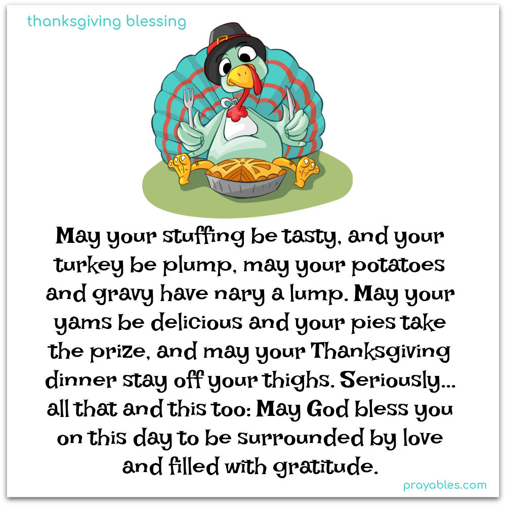 May your stuffing be tasty, and your turkey be plump, may your potatoes and gravy have nary a lump. May your yams be delicious and your pies take the prize, and may your Thanksgiving dinner stay off your thighs. Seriously…all that and this too: May God bless you on this day to be surrounded by love and filled with gratitude.