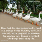 Dear God, I'm disorganized and in need of a change. I need to put my ducks in a row so I can be prepared for whatever You send my way. Blessed is my God, who brings order to my life. … [Read more...]