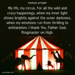 My life, my circus. For all the wild and crazy happenings, when my inner light shines brightly against the outer darkness, when my emotions run from thrilling to exhilaration, I thank You, Father God, Ringmaster on High. … [Read more...]