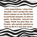I defy expectations. I stray from the path. I don't accept the rules others impose on me. My life has no particular purpose, no aims or goals, no direction, and yet I am happy. Thank You dear God, my Creator, who joyfully watches as I live my life in … [Read more...]