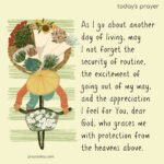 As I go about another day of living, may I not forget the security of routine, the excitement of going out of my way, and the appreciation I feel for You, dear God, who graces me with protection from the heavens above. … [Read more...]