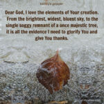 Dear God, I love the elements of Your creation. From the brightest, widest, bluest sky, to the single soggy remnant of a once majestic tree, it is all the evidence I need to glorify You and give You thanks. … [Read more...]
