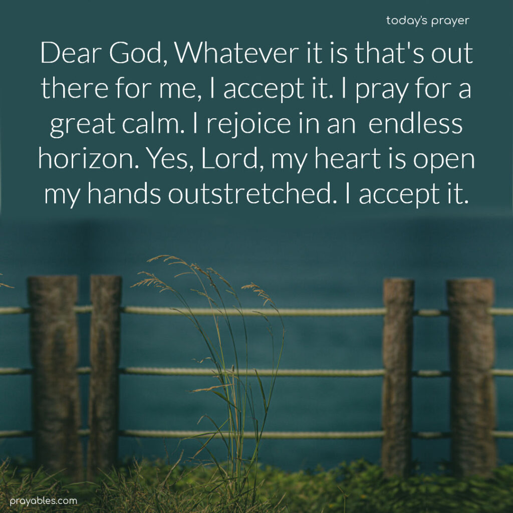 Prayer: Accepting God’s Gift Dear God, Whatever it is that’s out there for me, I accept it. I pray for a great calm. I rejoice in an endless horizon. Yes, Lord, my heart is open, my hands outstretched. I accept it. Print 🖨