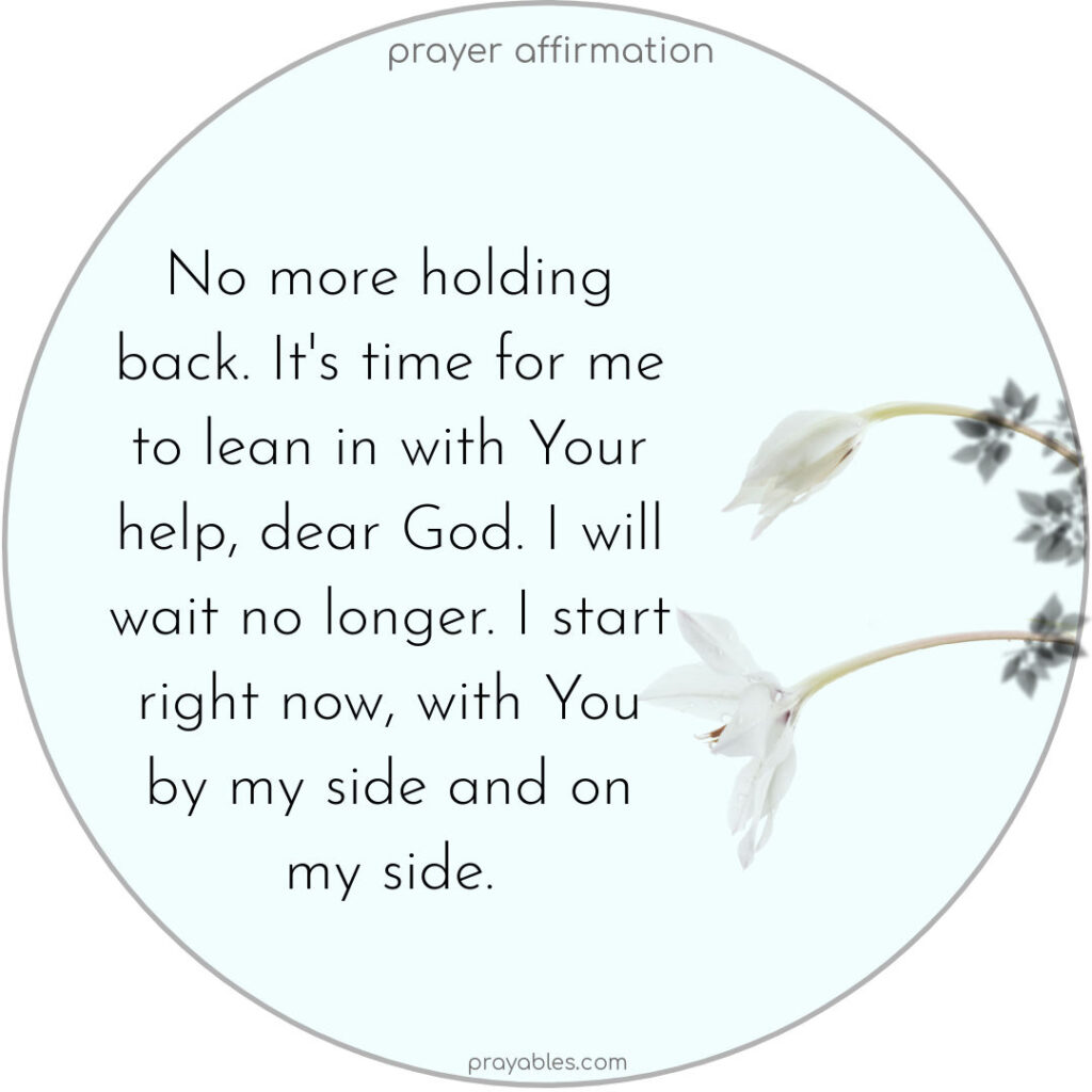 Prayer Affirmation: Lean In No more holding back. It’s time for me to lean in with Your help, dear God. I will wait no longer. I start right now, with You by my side and on my side. Print 🖨