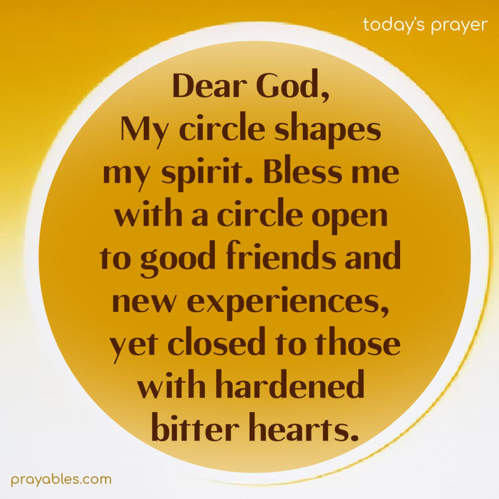 Prayer: Circle of Spirit Dear God, my circle shapes my spirit. Bless me with a circle open to good friends and new experiences, yet closed to those with hardened, bitter hearts. Print 🖨