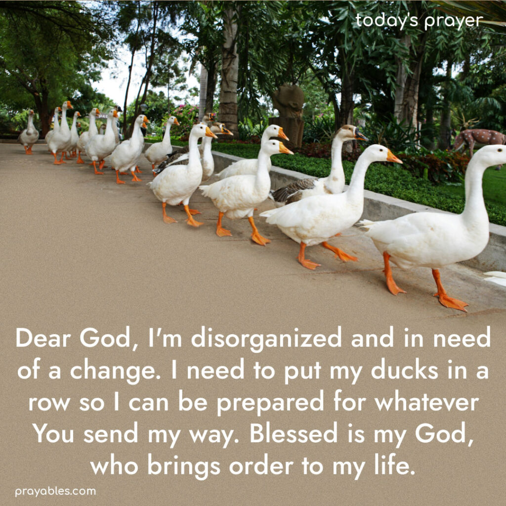 Prayer: Ducks in a Row Dear God, I’m disorganized and in need of a change. I need to put my ducks in a row so I can be prepared for whatever You send my way. Blessed is my God, who brings order to my life. Print 🖨