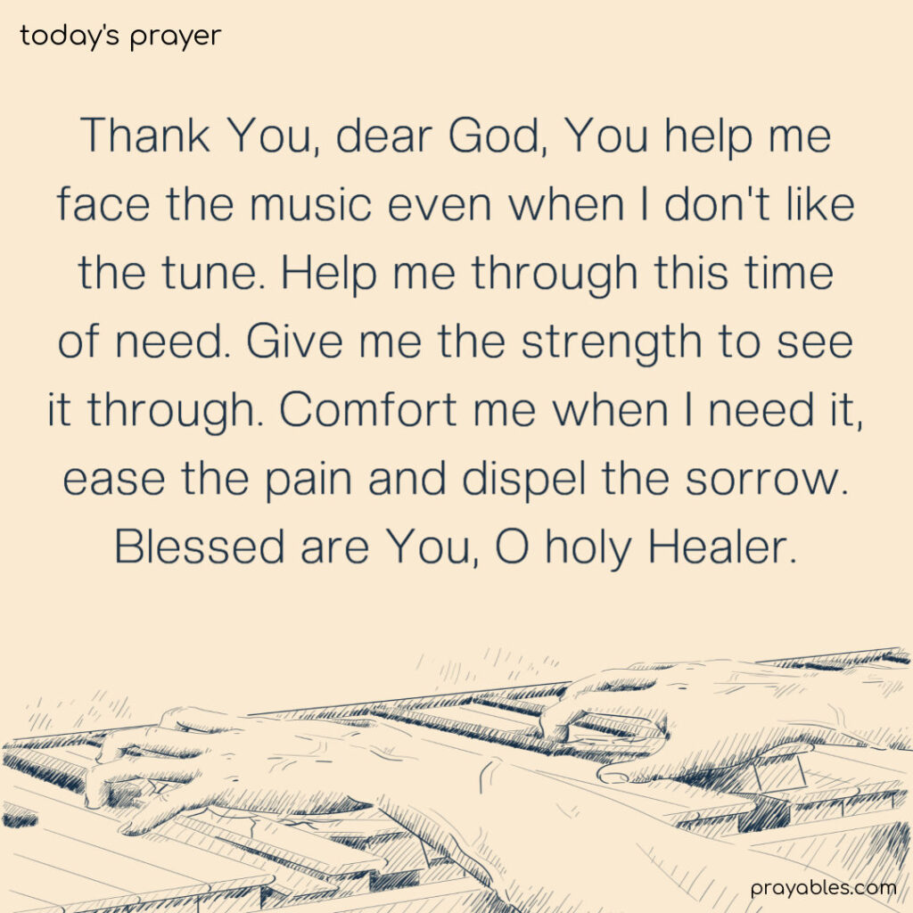 Thank You, dear God, You help me face the music even when I don’t like the tune. Help me through this time of need. Give me the strength to see it through. Comfort me when I need it, ease the pain, and dispel the sorrow. Blessed are You, O holy Healer.
