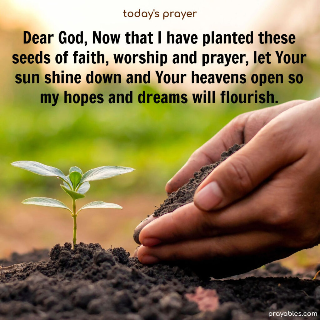 Prayer: Faith, Worship & Prayer Dear God, now that I have planted these seeds of faith, worship, and prayer, let Your sun shine down and Your heavens open so my hopes and dreams will flourish. Print 🖨