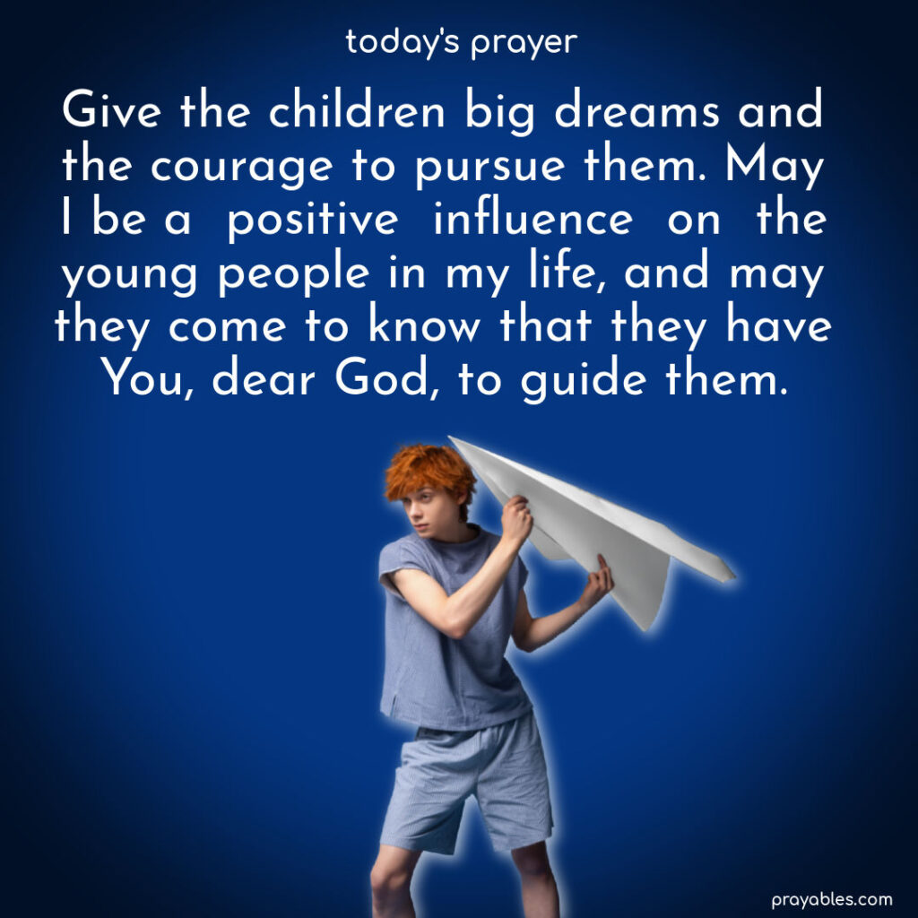 Prayer: For the Youth Give the children big dreams and the courage to pursue them. May I be a positive influence on the young people in my life, and may they come to know that they have You, dear God, to guide them. Print 🖨