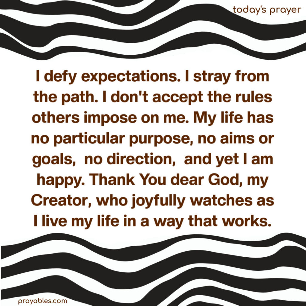 I defy expectations. I stray from the path. I don’t accept the rules others impose on me. My life has no particular purpose, no aims or goals, no direction, and yet I am happy. Thank You dear God, my Creator, who joyfully watches as I live my life in a way that works.