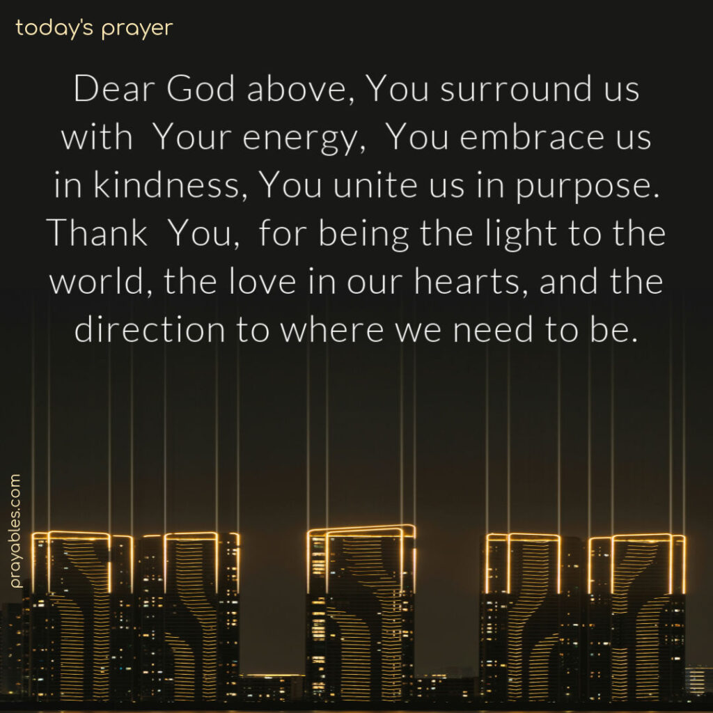 Dear God above, You surround us with Your energy, You embrace us in kindness, You unite us in purpose. Thank You, for being the light to the world, the love in our hearts, and the direction to where we need to be.