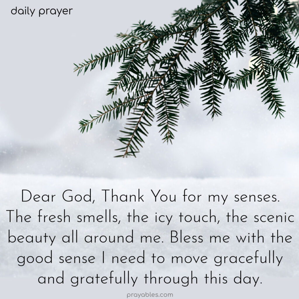 Prayer: Grateful Through the Day Dear God, Thank You for my senses. The fresh smells, the icy touch, and the scenic beauty all around me. Bless me with the good sense I need to move gracefully and gratefully through this day. Print 🖨