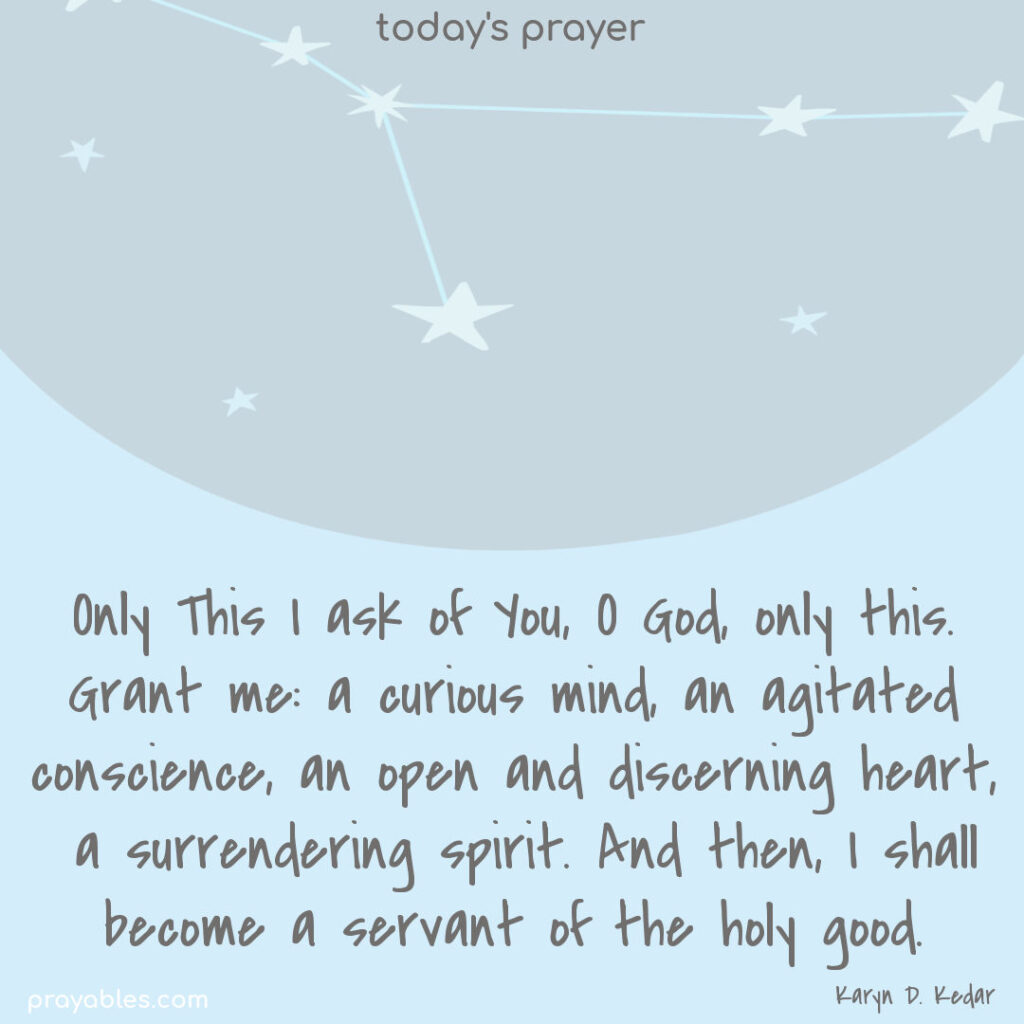 Only this I ask of You, O God, only this. Grant me: a curious mind, an agitated conscience, an open and discerning heart, a surrendering spirit. And then, I shall become a servant of the holy good.  Karyn Kedar
