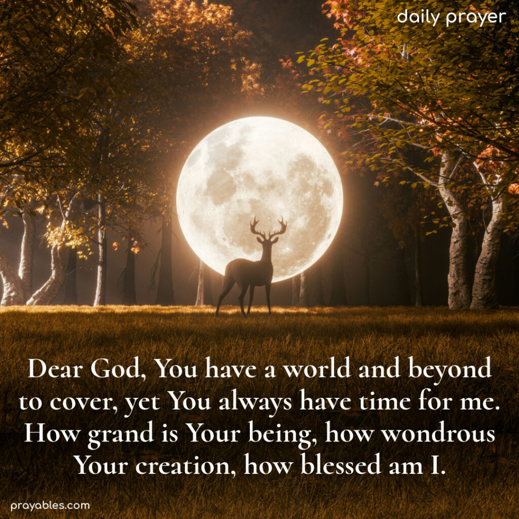 Prayer: Time for Me Dear God, You have a world and beyond to cover, yet You always have time for me. How grand is Your being, how wondrous Your creation, how blessed am I. Print 🖨